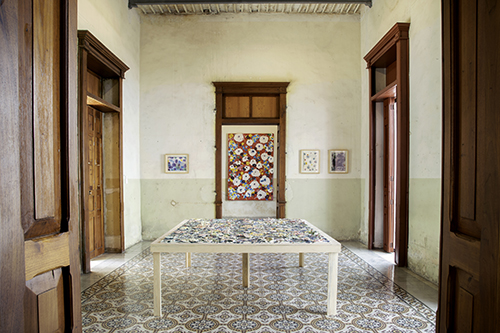 Las acuarelas ocupan un lugar especial. Para realizarlas, la artista sumergió directamente el papel en mares y lagos, incorporando el agua como materia activa en el proceso. El resultado son superficies que respiran humedad, movimiento y atmósferas costeras, obras capaces de transformar cualquier ambiente interior. Las pinturas de gran formato recuperan motivos florales inspirados en textiles de su infancia. Aquí, la decoración se convierte en memoria: patrones que evocan tapices, cortinas y manteles reinterpretados como composiciones contemporáneas.