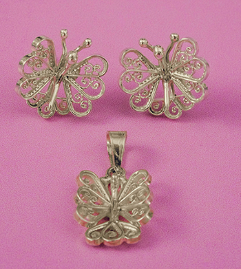 La plata da a la filigrana un brillo elegante y lo transforma en una etérea mariposa que trae a la memoria la belleza de la naturaleza.