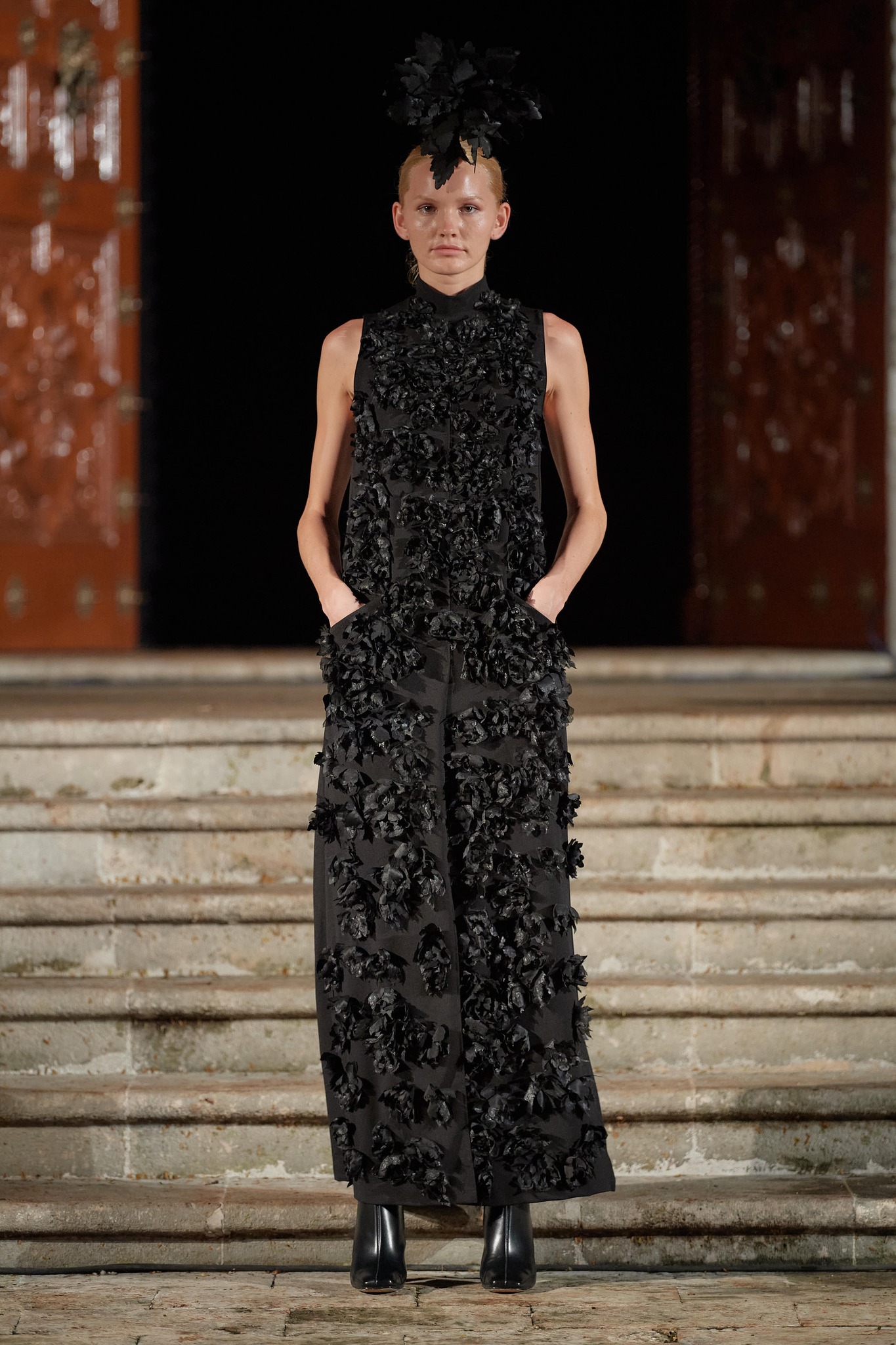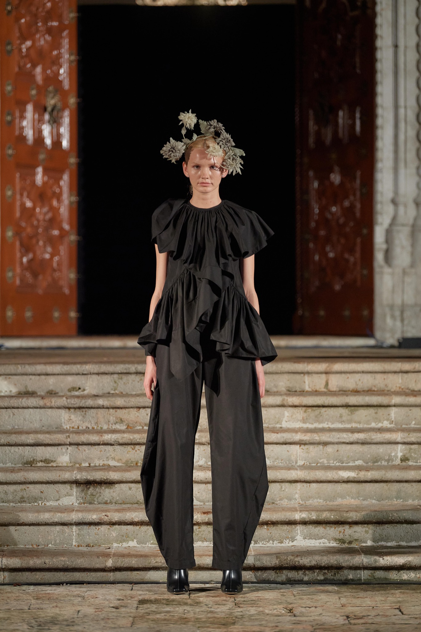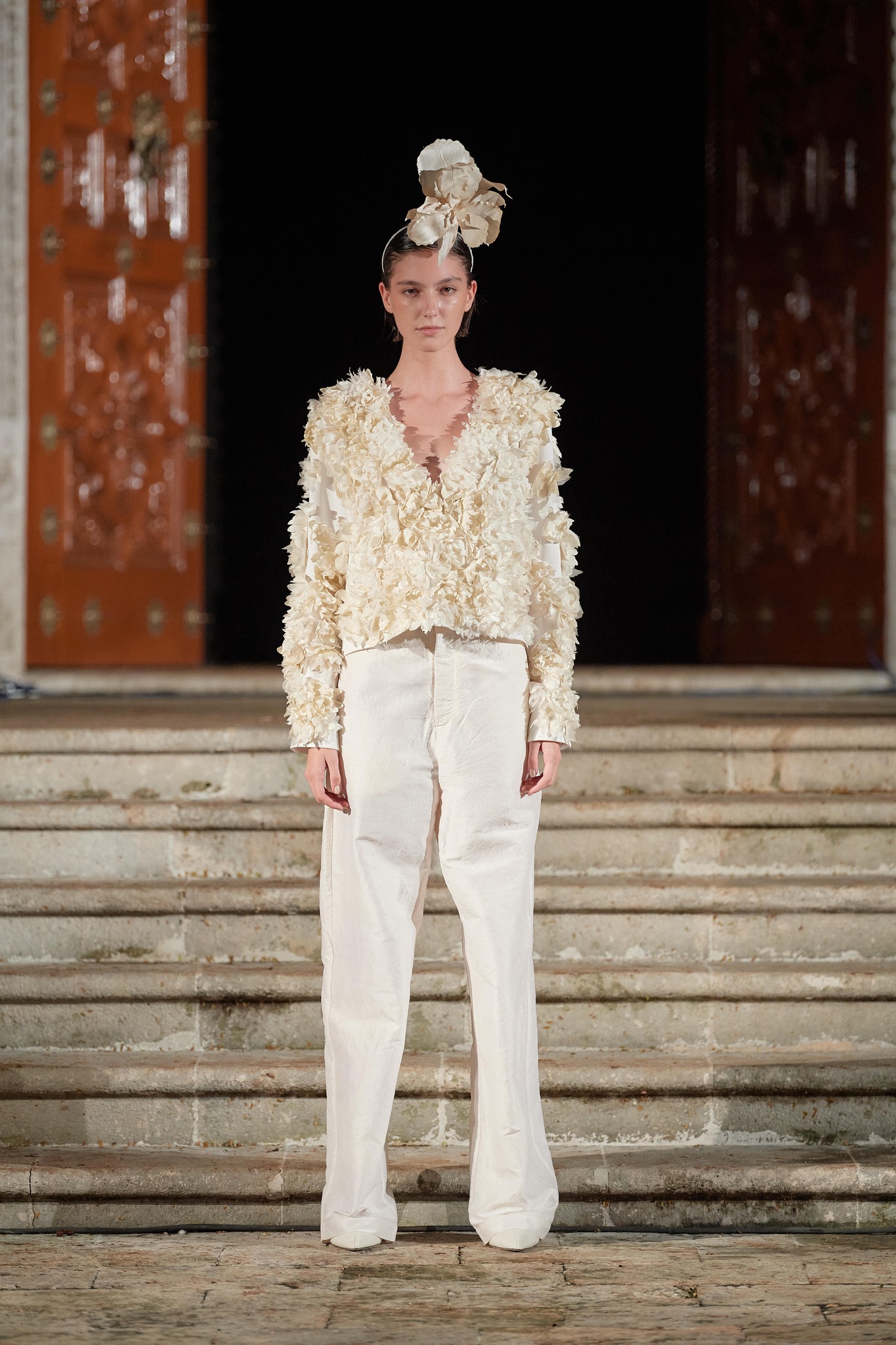 Por otro lado, Cancino se mira al espejo una vez más para hacer un viaje introspectivo, que lo lleva a visitar una nueva inspiración. La idea de rendir un homenaje a quien fuera una de sus fuentes de inspiración, no solo por su obra sino también por lo que simboliza, Frida Kahlo. Sin embargo, esta misma iconicidad se convertiría en un dilema ¿Cómo hacer un homenaje justo? ¿Cómo lograr representar la esencia de la pintora sin caer en los lugares comunes? En un arrebato renuncia a todos los símbolos mundiales con los que reconoceríamos a la autora y crean un nuevo altar para los años en los que Frida empieza a recolectar sus propias vivencias, que la llevan a construirse a sí misma como esta mujer llena de folclor y de dolor. Francisco se pregunta y se imagina ¿cómo sería el presente de Frida? y ¿cómo hubiera asimilado los procesos socioculturales de la actualidad? El proceso para crear esta colección culminaría con una colaboración interdisciplinaria que rescata el mismo exotismo que Frida Kahlo tenía en su vida y en sus obras: La naturaleza, los sueños y las culturas prehispánicas. La primera es un ejercicio de estampación de la mano de la acuarelista Mariana Magdaleno, en la que recrea la fauna presente en la iconografía de Frida, monos, ciervos, xoloitzcuintles y demás. La segunda es una colección de accesorios escultóricos, en los que se retoman los objetos oníricos de la artista, el objetivo es crear en tridimensionalidad de alambres, para lo cual Cancino une fuerzas con los artistas David Herrera y Pablo Cobo del proyecto “Máscaras de Alambre”. Y la tercera es una serie de tocados, que añade sincretismo al ser elaborados con una técnica antigua de construcción que consiste en dar forma de manera manual, realizando pétalos de seda recortados a mano, teñidos y hormados con calor. Dicha colaboración se hizo en compañía de la leyenda de la sombrerería, el diseñador español Angel Amor.